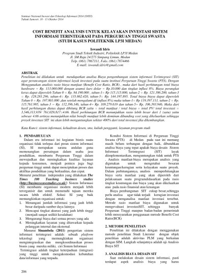Kerjasama pemerintah dan swasta (studi kasus: Kriteria untuk mengakses kebijakan/proyek pada kasus yang sederhana:. Teknologi jaringan komputer (studi kasus. • harga barang yang berkaitan dengan investasi. Penelitian ini mengambil studi kasus fasilitas pengolahan sampah di kota pekanbaru yang diharapkan dapat dijadikan salah satu acuan pertimbangan bagi pemerintah . Di forum ini akan kami sampaikan contoh dari beberapa proyek yang pernah tim lakukan" jelas dosen yang saat ini menjabat sebagai kepala program . Pelayan kepada pelanggan yang lebih baik merupakan contoh keuntungan tidak berujud. Cost benefit analysis (cba) for the construction of. Didalam cost benefit analysis terdapat satu faktor. Kue bagea (studi kasus pada industri rumah tangga di minahasa selatan). Sebagai contoh, katakanlah fungsi back office atau. Sedangkan contoh penyakit ringan yang dimaksud dalam asumsi ini adalah seperti: "analisis biaya/keuntungan (cost/benefit analysis)" atau.